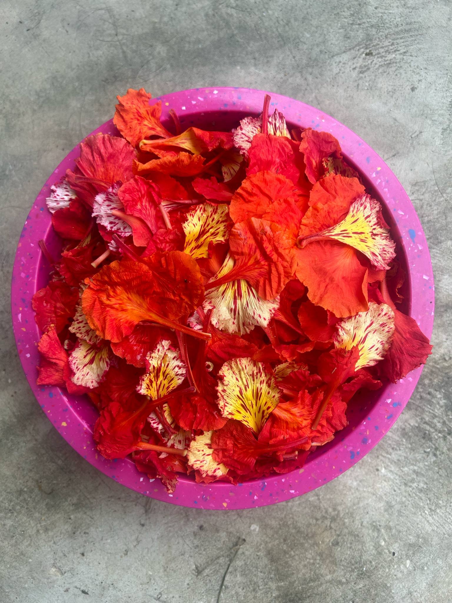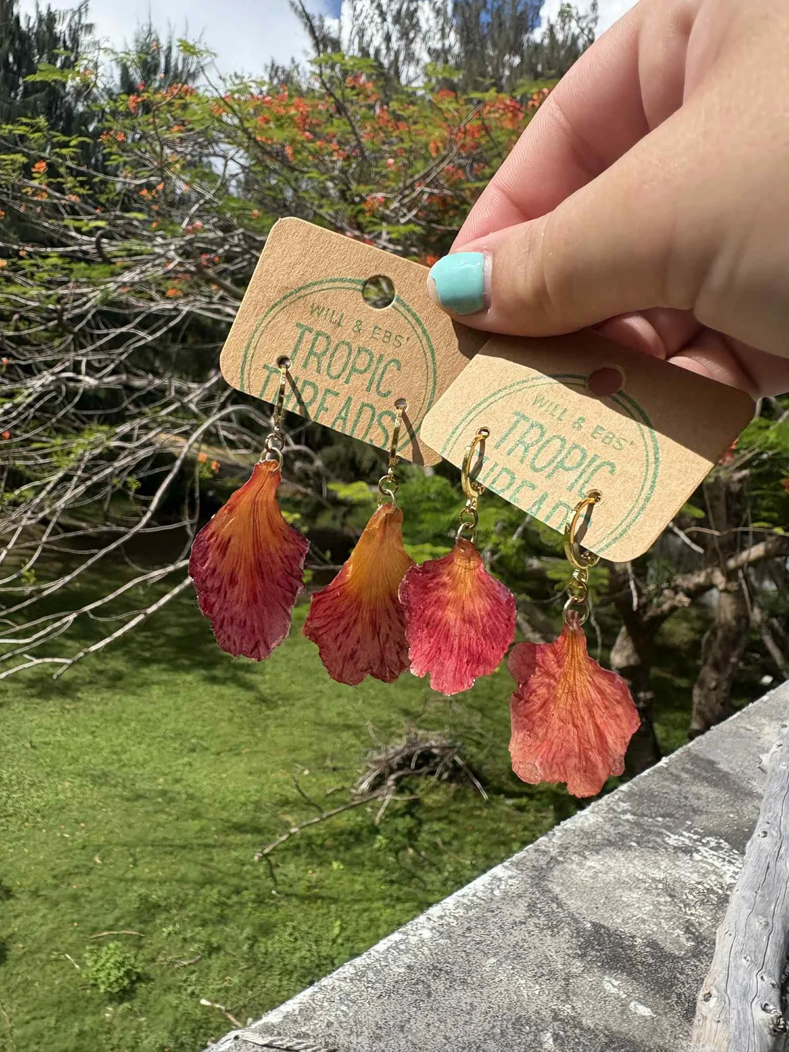 Harvested locally in Saipan, these earrings are made from the petals of our beautiful Flame Trees. They are coated in resin - lightweight and vibrant. Each pair will be slightly different since they are made from organic products, and can vary slightly from the pair pictured.